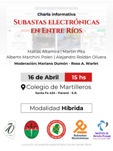 El Colegio de Martilleros Públicos de Entre Ríos junto al Colegio de Abogacía y a @esubasta los invitamos a la Charla informativa: “Subastas Electrónicas en Entre Ríos”, un espacio de análisis e intercambio sobre una temática de creciente relevancia en el ejercicio profesional.